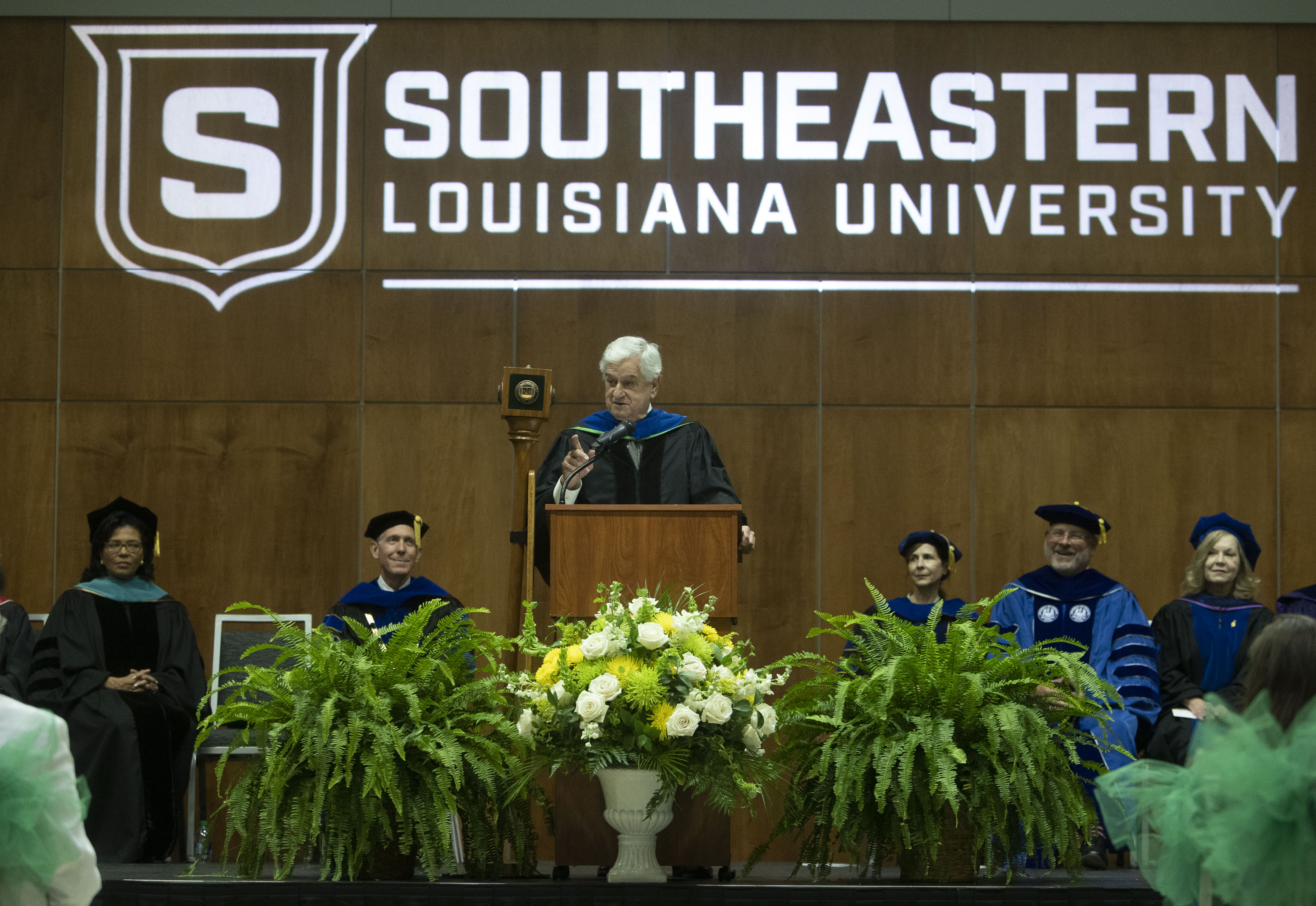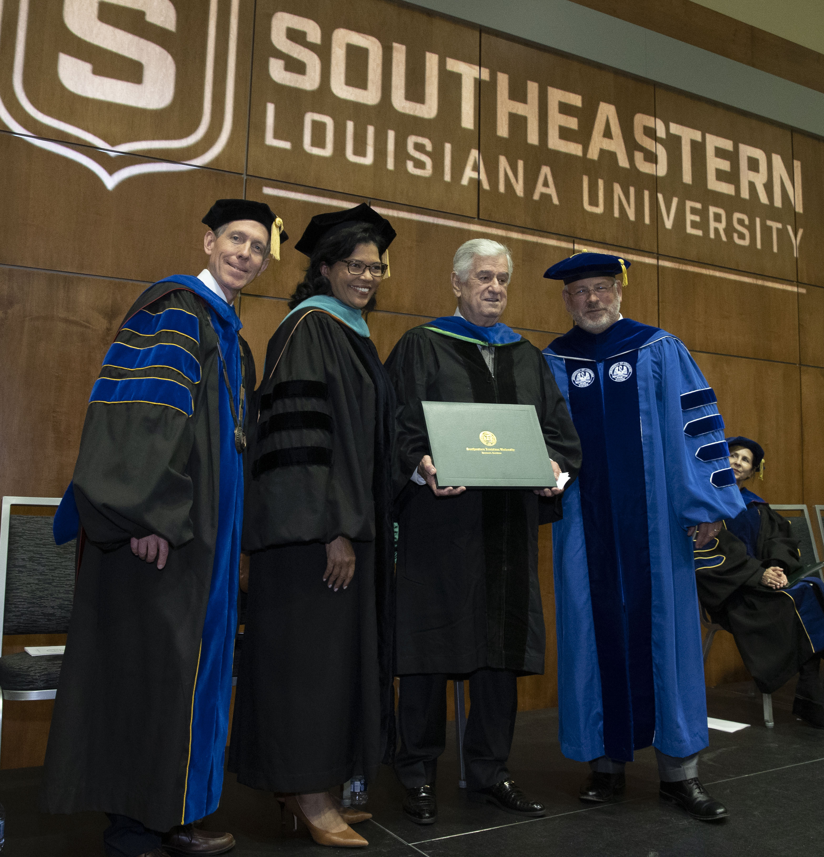 Additionally, former Louisiana Senate President John A. Alario, Jr. was presented an honorary doctor of humanities (LHD) degree in a separate ceremony. A 1965 graduate of Southeastern, he was recognized for his lifetime of public service, including his 48-year tenure in both the Louisiana House of Representatives and the Senate, as well as his civic service with numerous non-profit organizations, and his support over the years to Southeastern.